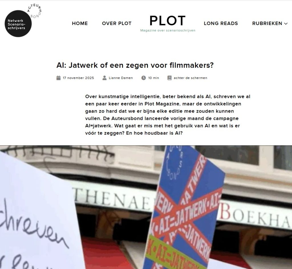 Voor Plot Magazine, het vakblad voor scenaristen, schreef ik voor het novembernummer een artikel over AI, naar aanleiding van de campagne van de Auteursbond AI=jatwerk. Met dank aan Elbert van Strien, Bert Bouma en Tijs van Marle: AI: Jatwerk of een zegen voor filmmakers? – Plot Magazine