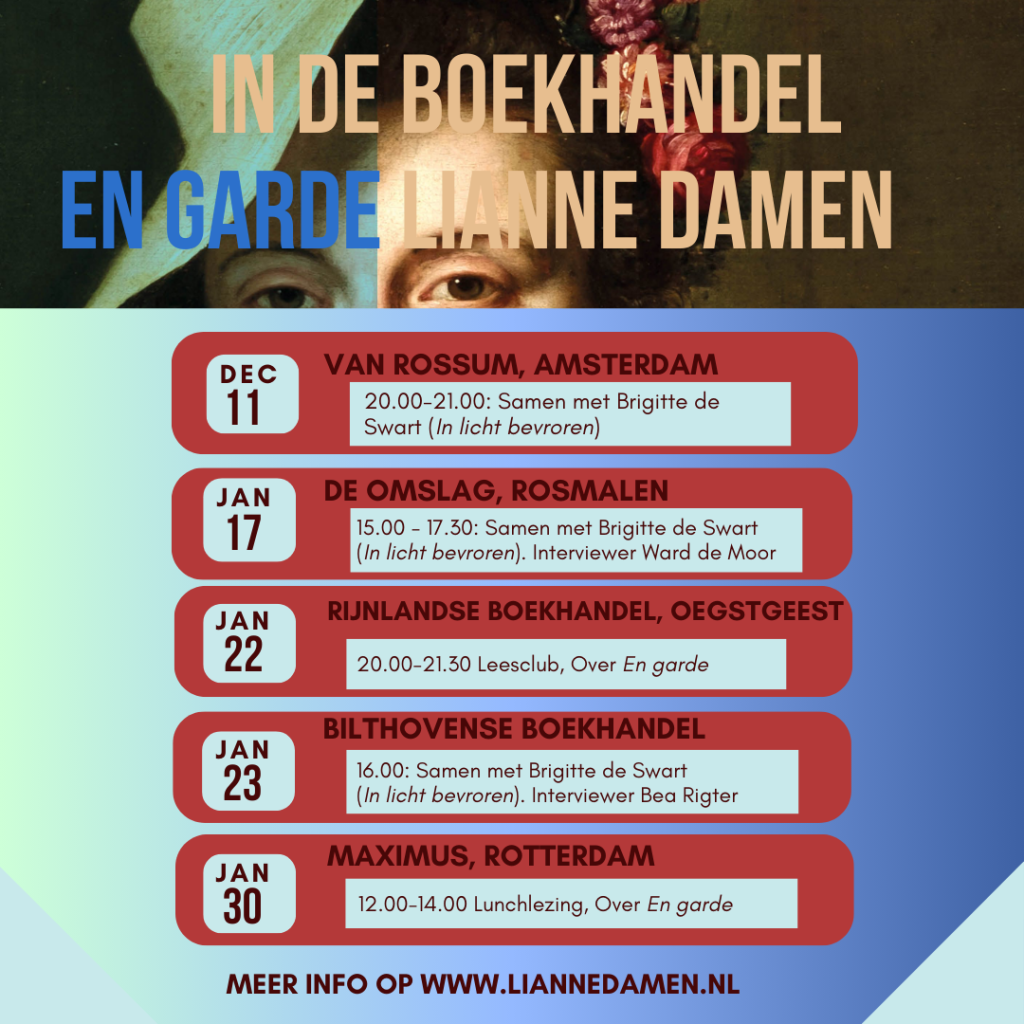 Woensdag 5 november werd ik samen met Brigitte de Swart geïnterviewd in boekwinkel ’t Pakhuys in Edam. Ik over mijn roman En garde over een transvrouw avant la lettre in het roerige Europa van de verlichting, Brigitte over haar roman In licht bevroren over het turbulente leven van de Amsterdamse fotografe en verzetstrijdster Emmy Andriessen.