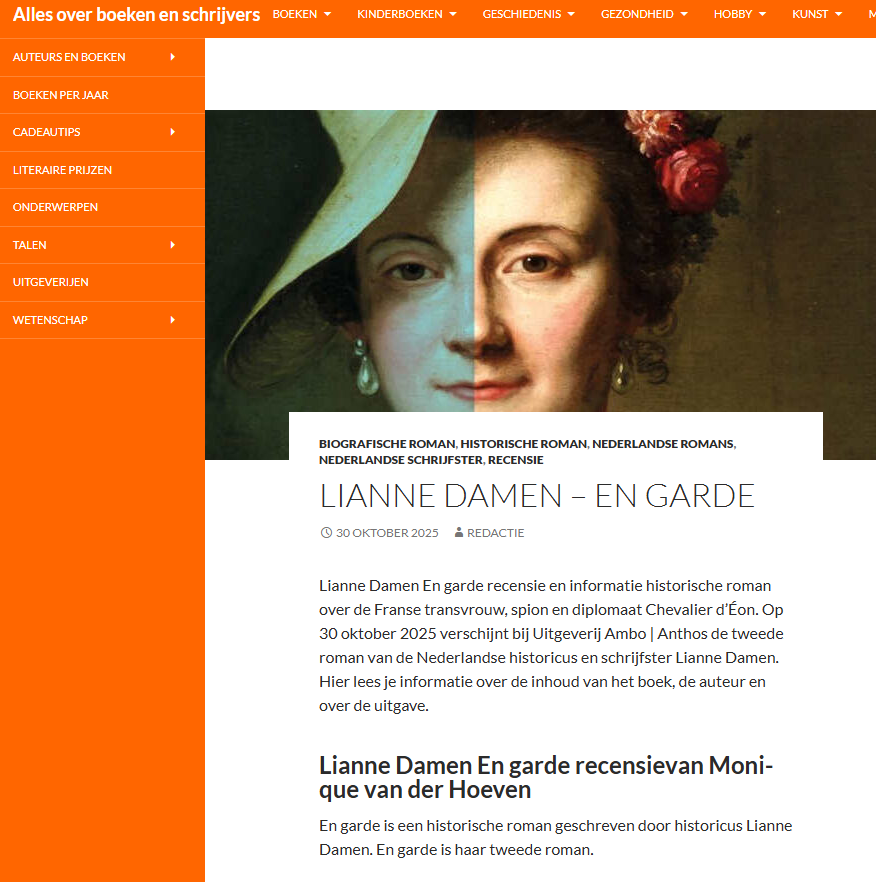 Lovende recensie van Albert van Goudoever op Hebban: ‘Lianne Damen is er niet op uit een wetenschappelijk werk over de chevalier d’Éon te schrijven, maar haar roman scherpt de problematiek rond deze persoon op sublieme wijze aan. Een boek dat zich heerlijk laat lezen. Zeer aan te bevelen.’ Lees verder op deze site.